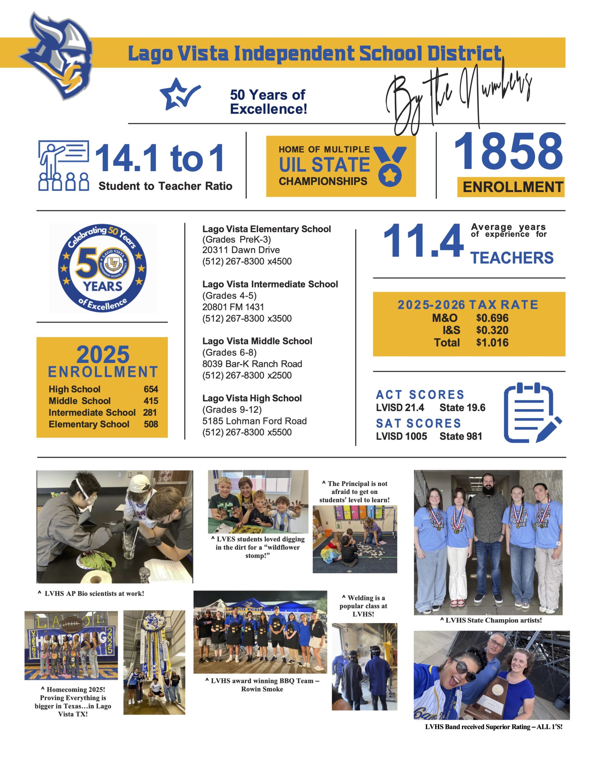 The Hollows is proud to be a part of the highly acclaimed Lago Vista Independent School District, one of the state’s top educational institutions. Lago Vista ISD is consistently ranked high in Central Texas District Rankings, with their standards of education reflected in their motto “Excellence In All We Do”. Featured in Best Public High Schools in Austin Monthly, Lago Vista ISD is committed to creating a community of learners dedicated to promoting high expectations and achievement for all students. Residents of The Hollows are eligible to attend the LVISD schools below.